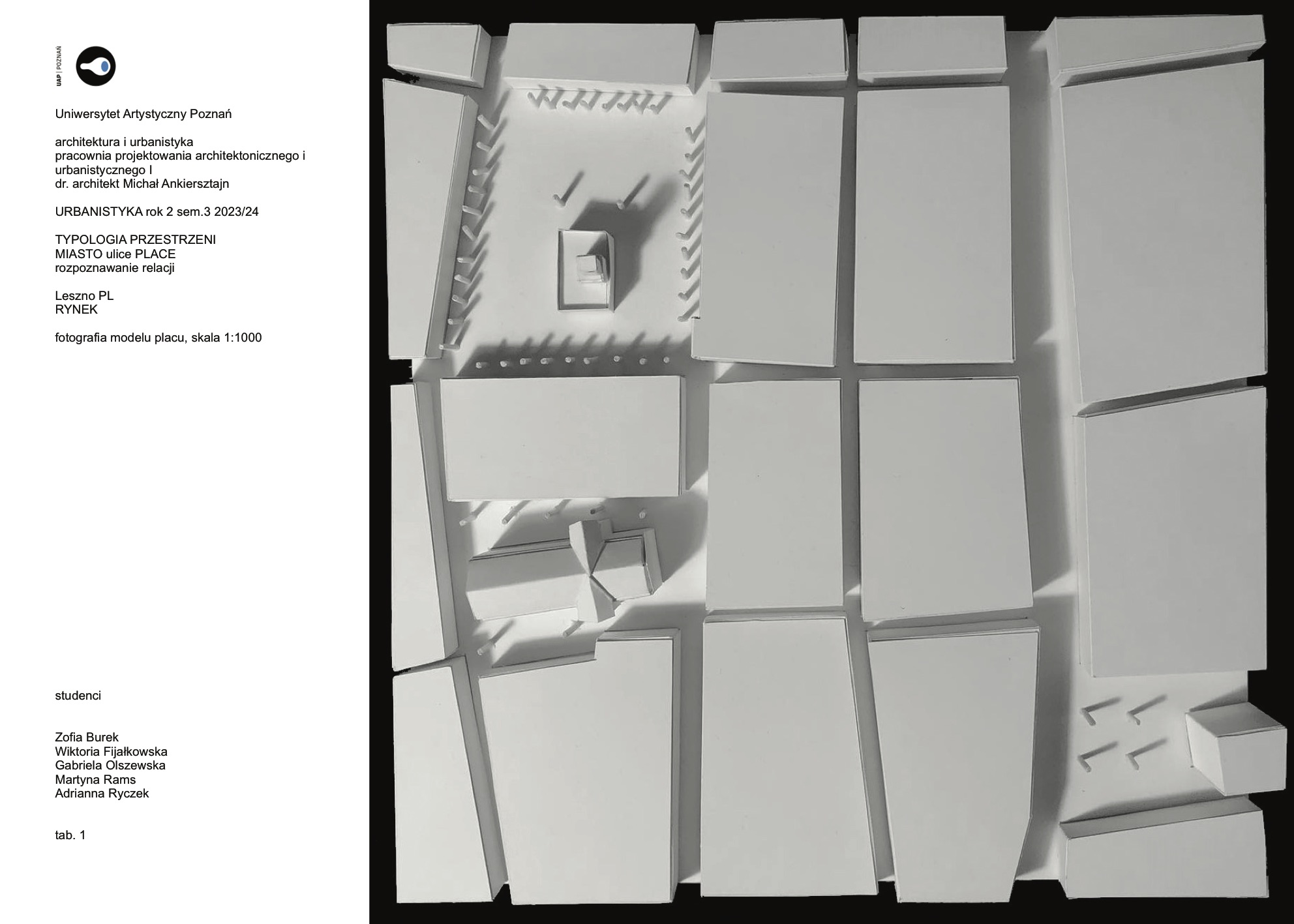 Etap 1 – lokalizacja krajowa, Polska, Leszno. Praktyczna analiza charakterystycznych istniejących przestrzeni miejskich. Poznawanie i tworzenie rysunków planów zadanych placów i najbliższego otoczenia. Odwzorowywanie tych przestrzenie w modelach tradycyjnych /kartonowych/ oraz cyfrowych. Wszystko poddane rygorowi zunifikowanej skali tak żeby konfrontować wzajemne relacje, poznawać historię istniejącej urbanistyki i zasady kompozycyjne nią kierujące. Syntetyzowanie przestrzeni w celu wydobycia idei przewodniej i zrozumienia miejskich relacji stworzonych przez służącą człowiekowi architekturę. Przejście od obserwowanego realizmu do idei twórczej.
