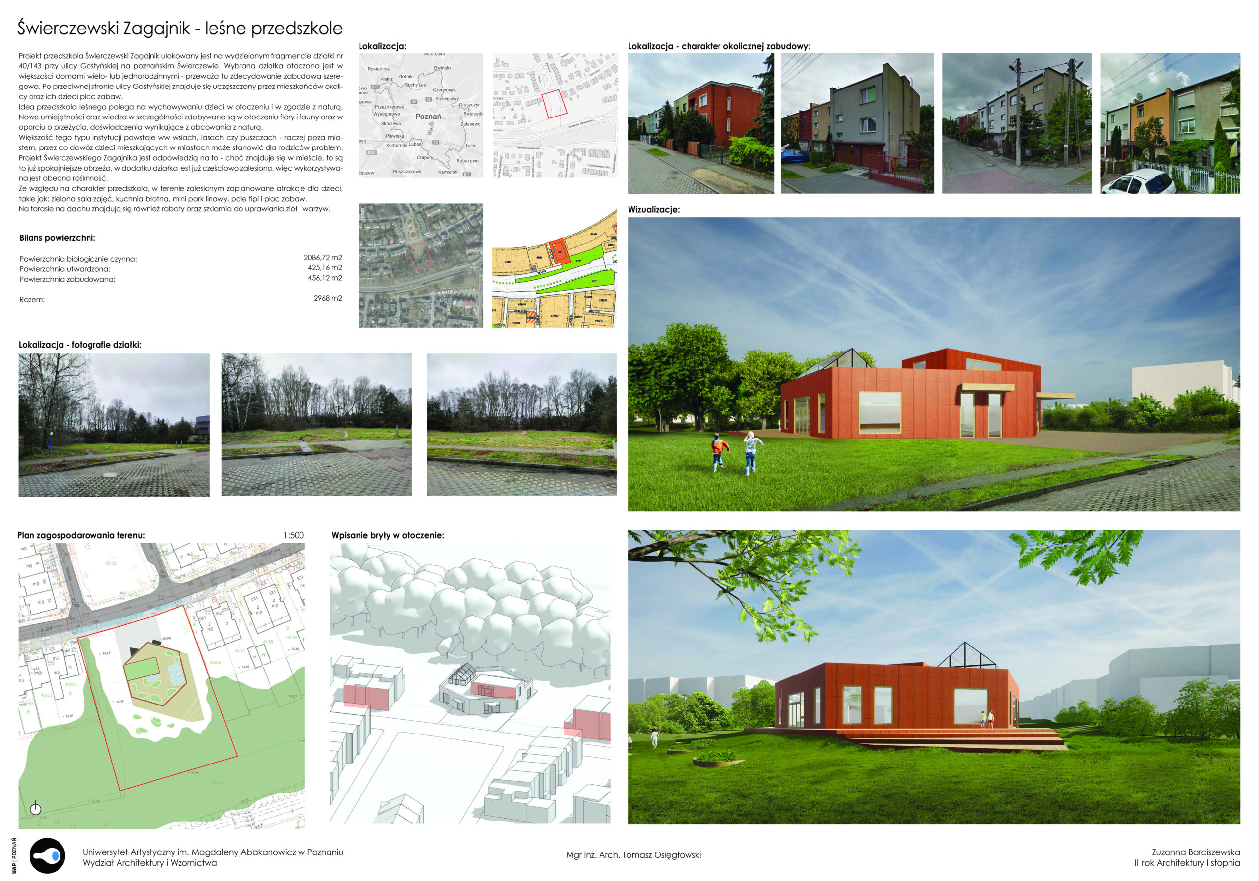 – projekt przedszkole na Świerczewie w Poznaniu. Budynek zlokalizowany wg wytycznych Miejscowego Planu Zagospodrowania Terenu. Heksagonalna forma parteru z bryłą piętra i szklarnią na dachu. Układ brył wpisany w układ płaszczyzn i linii otaczającego osiedla domków jednorodzinnych szeregowych. Wokół obiektu zaplanowano plac zabaw dla dzieci o leśnym charakterze wykorzystujący rozległy park którego działka projektowa jest częścią.